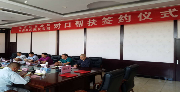 6月20日,怀柔区民政局主要领导带队来到河北省怀安县民政局,就对口帮扶和京津冀协同发展工作进行对接,签定对口帮扶协议。怀安县政府领导和民政局领导参加活动。据了解,此次帮扶活动,怀柔区民政局为怀安县送去了20万帮扶资金,动员社会力量北京圣泉寺为怀安县送去10万元帮扶资金。