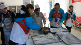 上午时分,工作人员和志愿者搬运完捐赠物资后分三组进行志愿服务。医务室里,血压计、血糖仪、B超设备、药物等一应俱全,大夫们摆好诊台候诊;餐厅里,志愿者和面拌陷儿,为老人们准备暖心午餐;活动室在工作人员的布置下,正准备一场小型义演活动。
